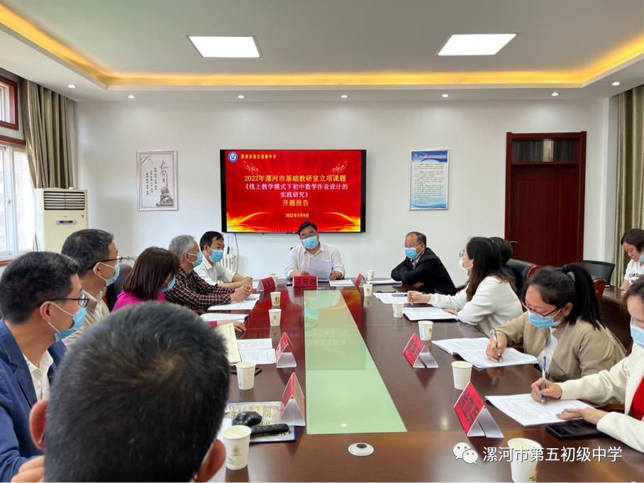 5月9日,漯河市第五初级中学2022市级课题《线上教学模式下初中数学作业设计的实践研究》与《线上教学提高学生积极性的探究》开题报告会在交通路校区三楼会议室召开。漯河五中校长马开收、副校长张俊华、副校长荆国志,教科室陈红凯主任、黄莹主任,教导处赵艳娟主任......